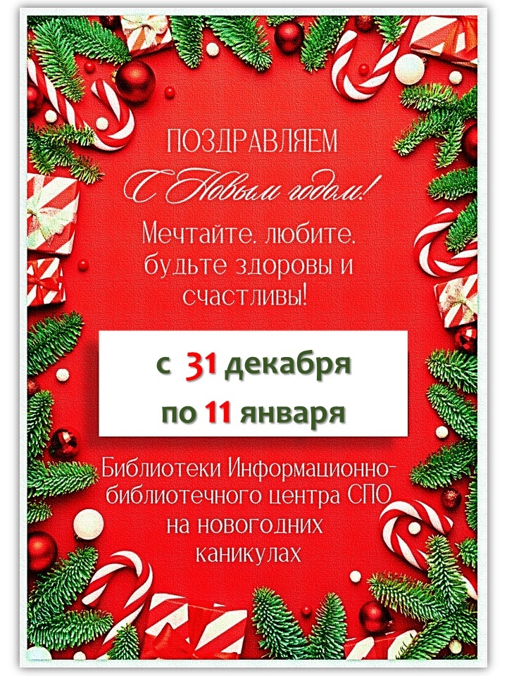 - 29 и 30 декабря — санитарные дни (библиотекари работают в Технологическом колледже Императора Петра I c 08:00 до 16:15).