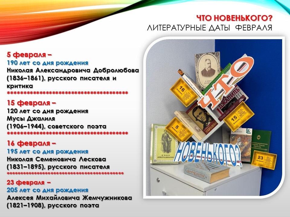 книжную выставку "Что новенького? Литературные даты февраля". О ком она?